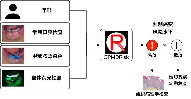 功能简介 OPMDRisk是一种基于机器学习技术所建立的个体化模型工具,它可用于预测口腔潜在恶性病变(oral potentially malignant disorders, OPMDs)的癌变危险程度。在本模型中输入患者的个体化信息和无创检测结果后,点击预测键即可瞬时获得组织病理学风险水平(高危或低危)。无创检测方法包括甲苯胺蓝染色(TB)和自体荧光检测(VEL scope);个体化信息包括患者的年龄和常规口腔检查情况(如病损部位、浸润感和临床印象等)。OPMDRisk通过整合两项无创检测结果和患者多项个体化信息,达到了较高的预测准确率(90%),这有助于避免高危患者被误判为低危而延误治疗时机。